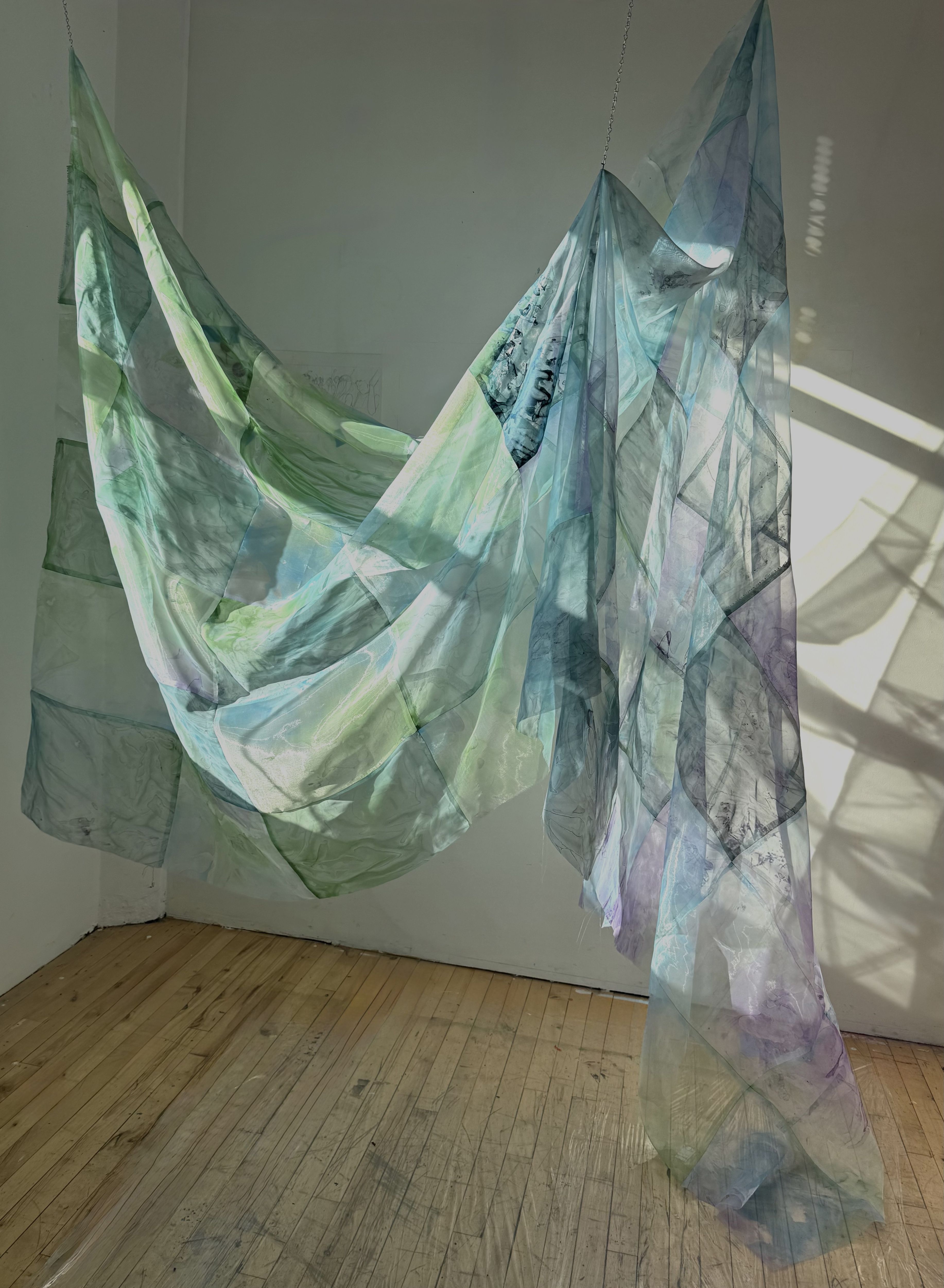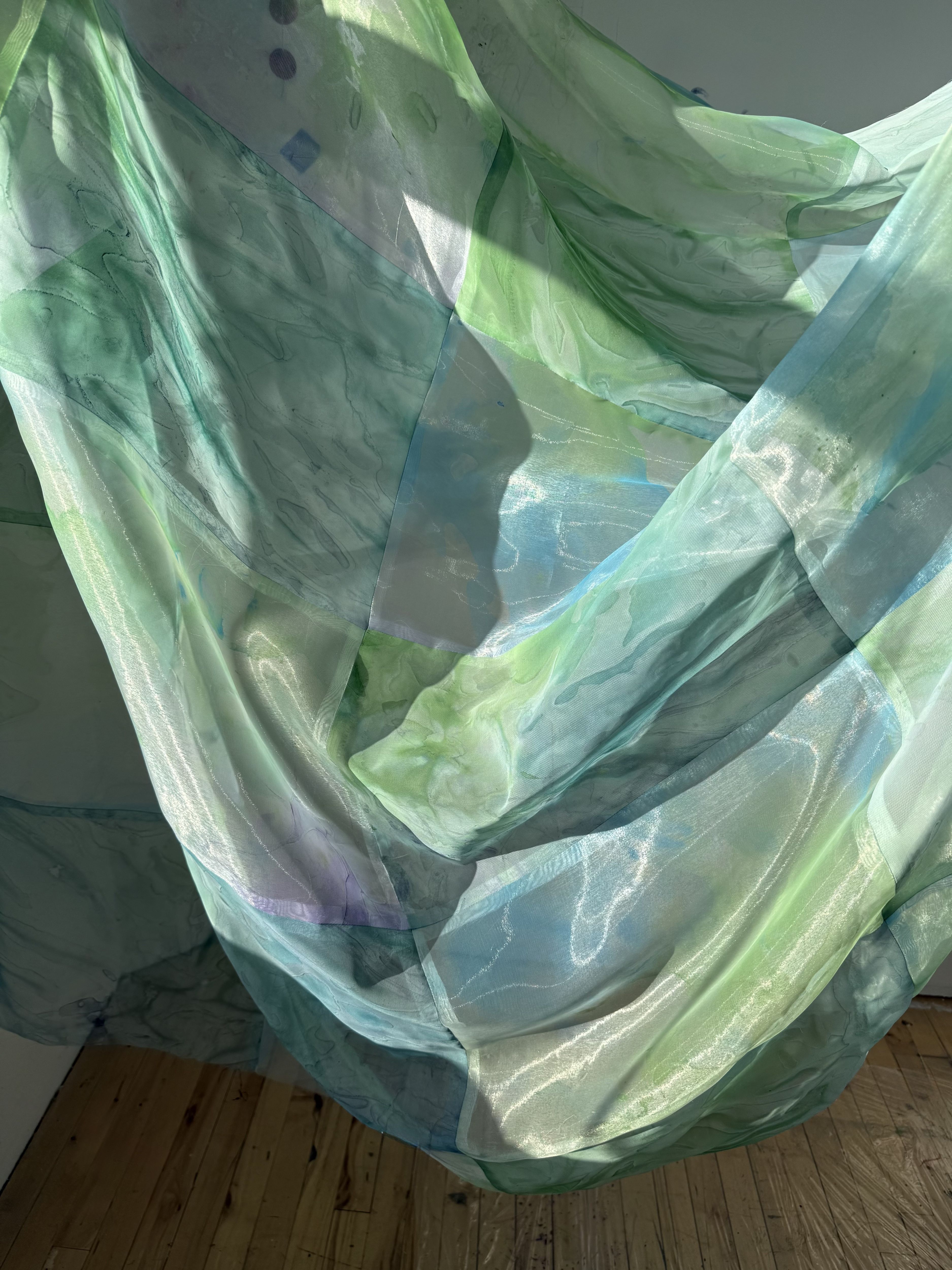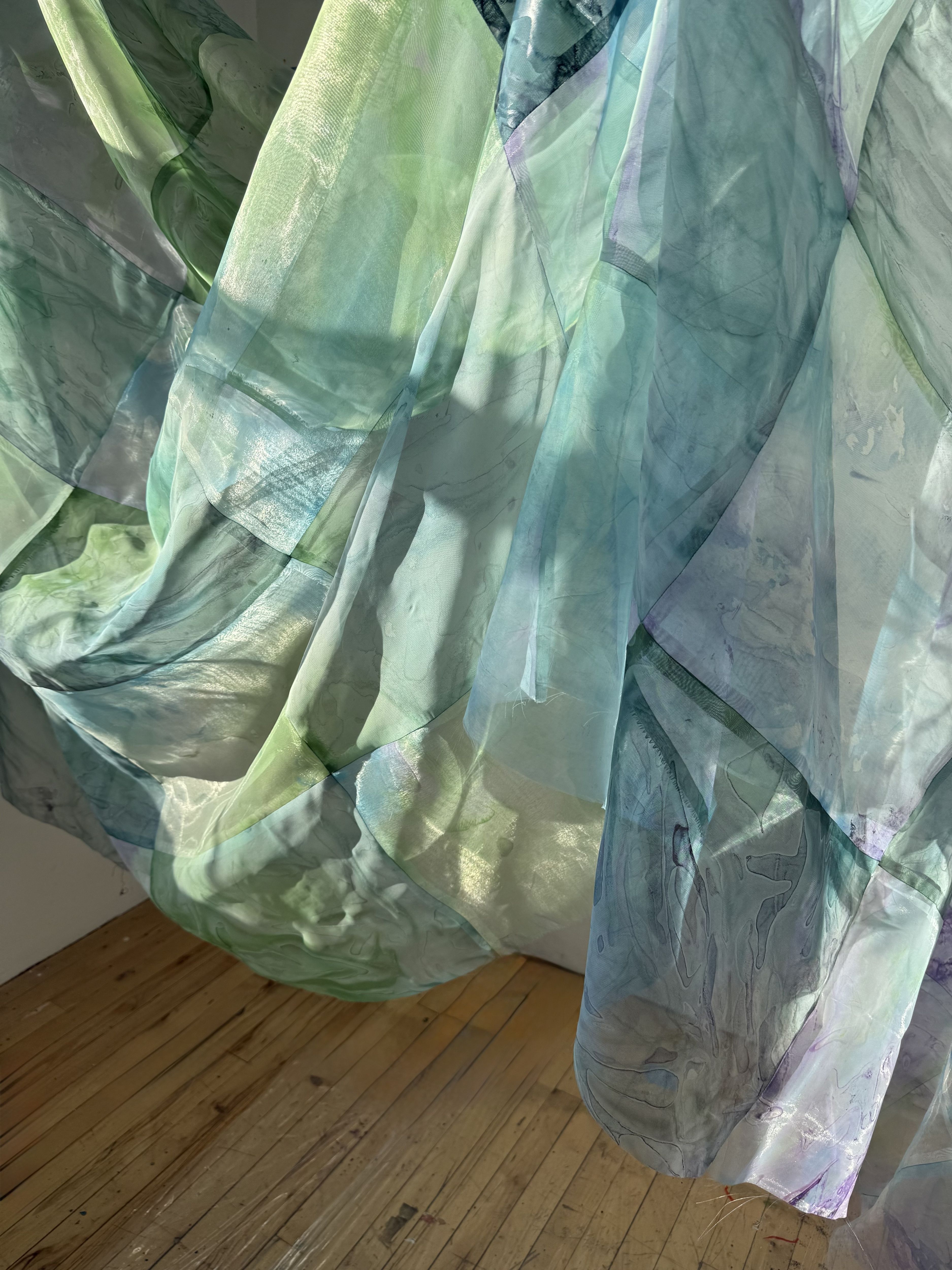 I work in textile and movement to explore personal and collective preservation, restoration, and expansion. Handmade banners (dyed, stitched, torn, appliqued, inked, embroidered) reference the visual, kinetic, and metaphoric elements of collective dance.